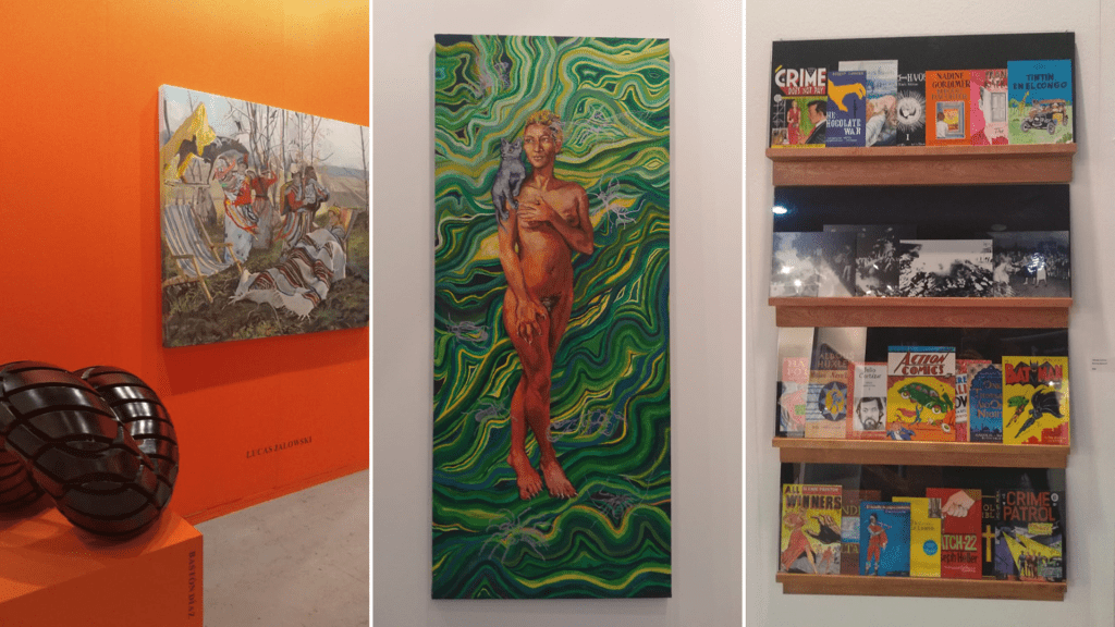 Hay puntos rojos que implican «ya vendido» sobre varias obras ubicadas sobre las paredes blancas -las panelerías- que organizan cada stand, como sucede con las miniaturas de Pablo Insaurralde. Lo mismo pasa junto a las pinturas sobre tarjetas SUBE de Pablo Rosales.