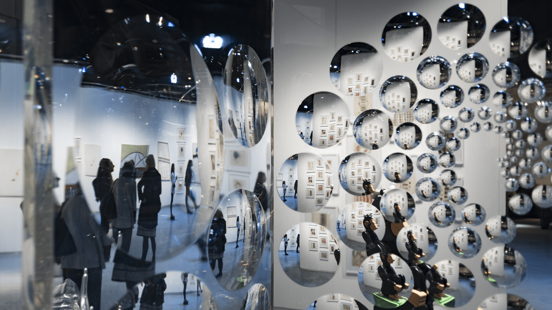 La obra de Tomás Saraceno en el stand de galería Benzacar -el primero que se ve apenas cruzar el hall de acceso a la feria- provoca bellísimos reflejos de colores sobre las paredes del cubo blanco que la contiene, estructuras de acero inoxidable con formas de nubes, o burbujas, o todo eso a la vez, cuyos paneles iridiscentes -como de vidrio- hacen su magia sobre las paredes reflejando tonalidades verde agua, rosa pálido o el violeta. Allí en ese mismo stand se ve una pintura circular -un tondo- inmenso del pintor Rómulo Macció, por el que varios coleccionistas se acercan a preguntar.