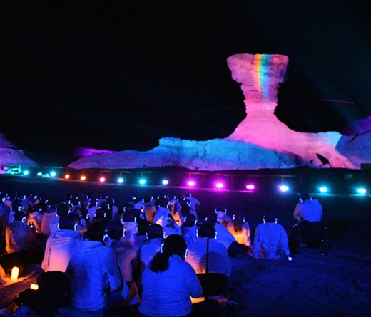 Una vez allí, medios, fans e influencers recibieron sus auriculares y una pulsera luminosa para ubicarse en mantas distribuidas frente a la inmensa estructura. A las 20.00hs en punto la estructura de piedra se iluminó y por los auriculares Chris Martin sorprendió a todos los invitados con un saludo personalizado y en español. De esa forma se dio inicio a lo que es considerado uno de los eventos más disruptivos, únicos e inigualables cuando se trata de preescuchas de discos.